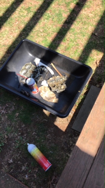 I got a lot done this weekend. The big one, SHE RUNS!!! New carb got here but the vacuum nipple from the hot air choke was broken off. I grabbed the one off the old carb, since its only the housing, and she started right up. Ran her for 30 minute clips 5 -6 times Saturday and Sunday. Timed her 6 before and now she purrs. I ordered the brake pads, rotors, crossover hood release cable and windows regulator with motor for the passenger side. I can open both doors with one hand now (WD-40 rocks). Hoping to be able to run around the block by this coming weekend.