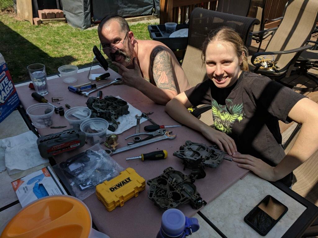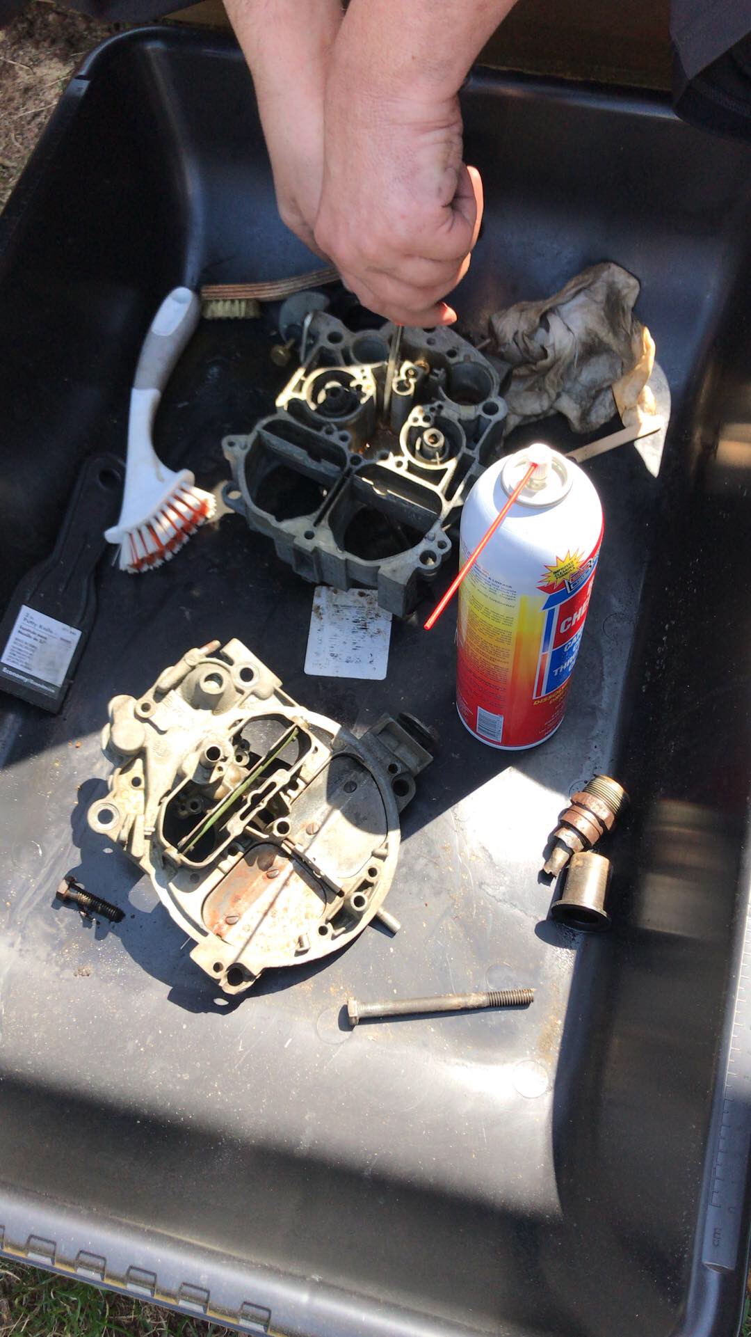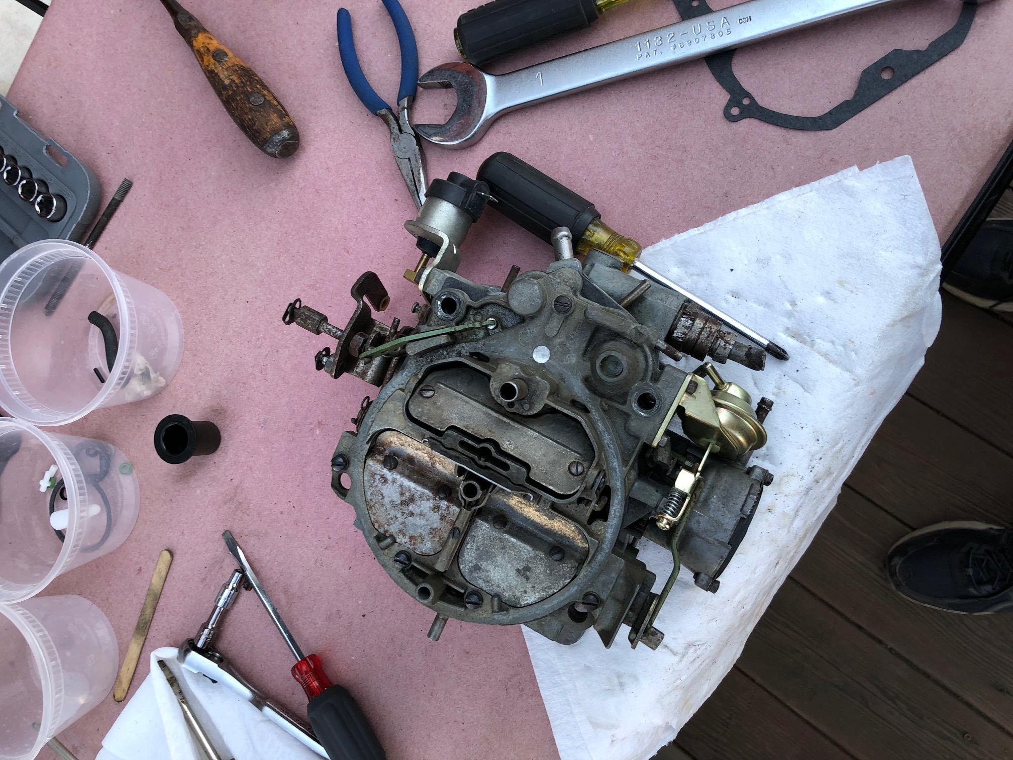 I had her running this morning. Def a carburetor issue. I pulled out the carb and Saturday, my sis-inlaw (My wife’s brother’s wife) Nikki is coming over to help me rebuild it. She’s almost as excited as me to work on this. Here’s the Rochester 4BBL 4006A carb.